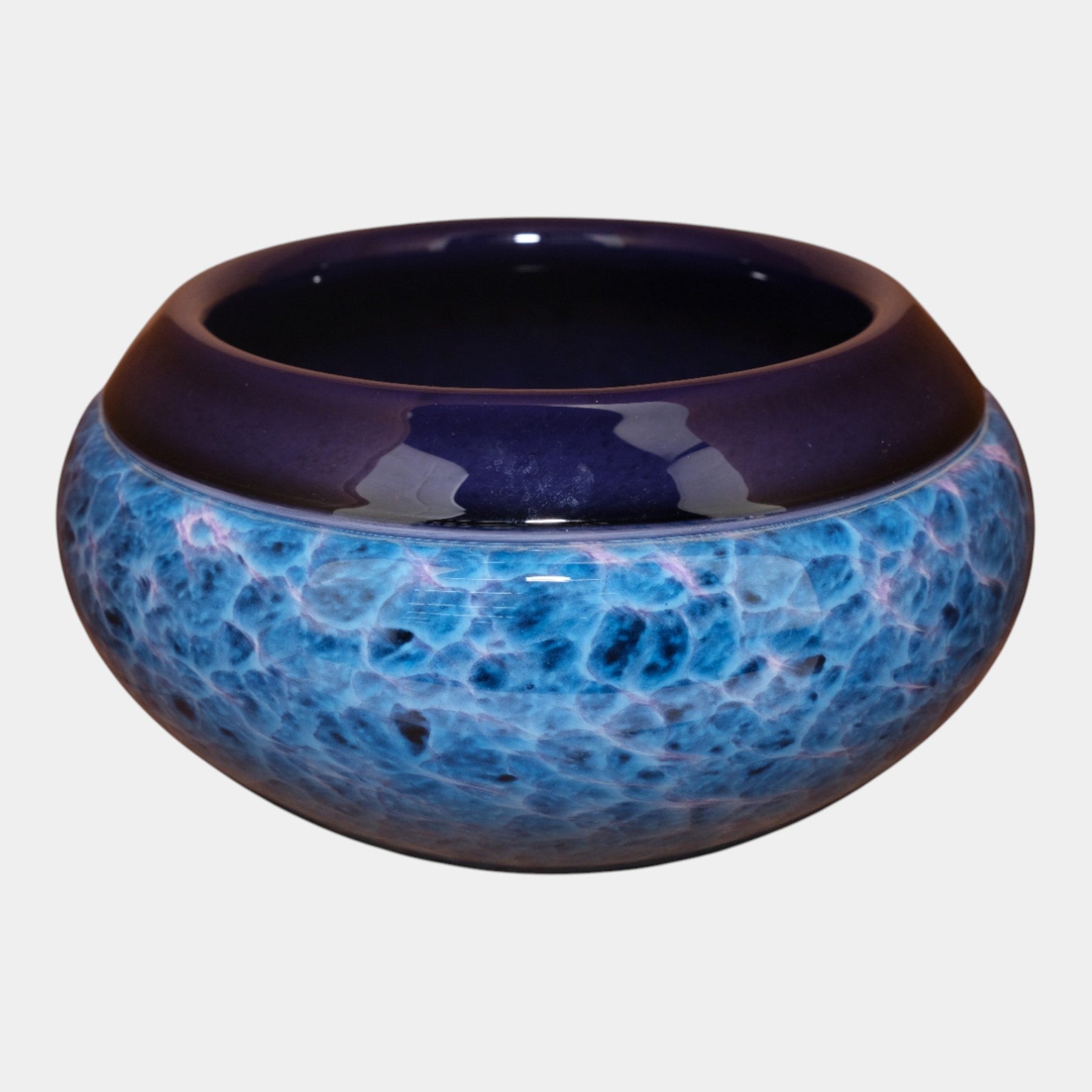 • Vibrantly and richly colored, this Curtis Brock art glass bowl features a deep indigo rim above a swirling mottled blue body, showcasing expressive contemporary studio-glass artistry with dynamic surface effects.